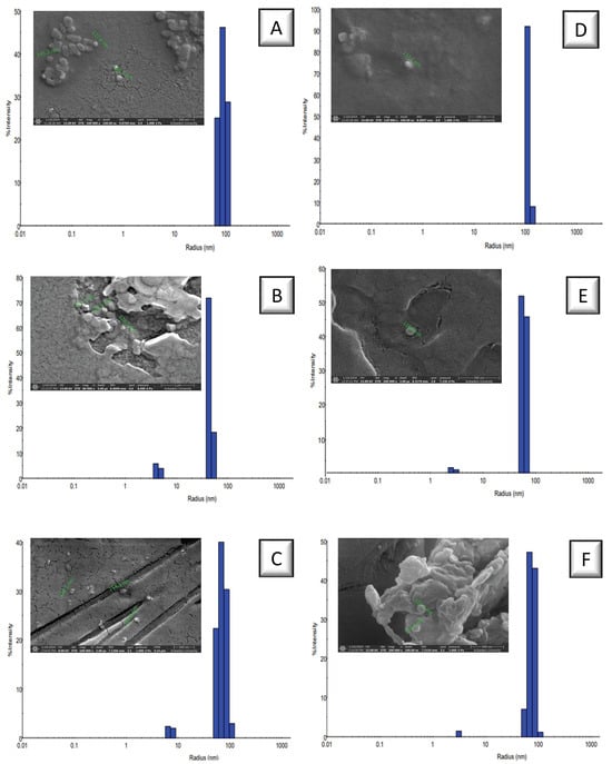DLS results in aqueous environment and SEM images of nonthiolated ((A–C) as NP1, NP2, NP3) and thiolated ((D–F) as NP4, NP5, NP6) NPs. (Scale bar: 500 nm).