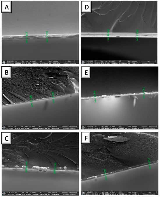 SEM images of the cross-sections of nonthiolated ((A–C) as NP1, NP2, NP3) and thiolated ((D–F) as NP4, NP5, NP6) NP-coated gold surfaces. The images were taken in tilted position.