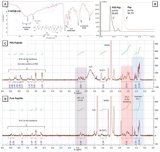 (A) FT-IR spectrum of Pep (NTS(8–13)), (B) HPLC chromatograms of Pep and PDS-Pep, (C) 1HNMR spectrum of PDS-Pep, and (D) 1HNMR spectrum of Pep (taken in DMSO-d6).