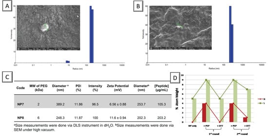 (A,B) DLS results and SEM images for NP7 and NP8, (C) characterization details, and (D) atomic percentages for NP8-coated surface via SEM-EDS mapping.