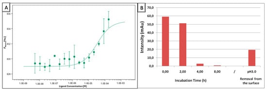(A) Binding affinity of NTS(8–13) peptide for NTSR2 antibody via microscale thermophoresis (n = 3), (B) changes in antibody amount upon incubation over peptide-conjugated NP-coated gold surface over time and its release in acidic environment.