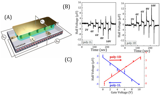 In a common Hall device, a magnetic field is applied perpendicular to the current flow direction on a surface, leading to an electric potential in a direction that is perpendicular to both. We developed a different application of the Hall device that does not require applying an external magnetic field. In this application, chiral molecules, including proteins, are adsorbed on a conducting substrate. When spin-polarized electrons are injected into the substrate from these chiral molecules, the current flowing through the device is deflected so that an electric potential can be measured perpendicular to the flowing current in the absence of a magnetic field (see Figure 1A) [30]. The Hall device can be embedded into an electrolyte solution, and an electric field can be applied between a gate electrode and the device. As a result of this electric field, the protein is polarized, and if the polarization is spin-dependent, a Hall signal is measured since spin-polarized charge is exchanged between the Hall device and the protein (Figure 1B). In Figure 1C, the Hall potential is presented as a function of the gate potential when the polymers arepoly(4-ethynylbenzoyl-l-alanine decyl ester) (poly-1L) [14] and poly(4-ethynylbenzoyl-d-alanine decyl ester) (poly-1D) are adsorbed on the surface [31].