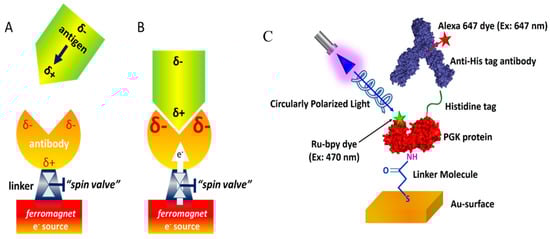 (A) The interaction of an antigen protein with an antibody is probed here, with a particular emphasis on the role of electrostatic interactions, both static and induced. When an antigen with a dipole moment approaches the antibody, it induces charge reorganization in the antibody. δ- and δ+ denote negative and positive charge accumulation, respectively. (B) The rate at which the antigen binds to the antibody depends on the amount of charge that can be accumulated at the binding site. This amount depends in this experiment on the ability of charge to move from the ferromagnet into the antibody. The rate of this flow is determined by a “spin valve”, which is based on the CISS effect (see text) and is dependent on the direction of the spin and the handedness of linker molecules attached to the ferromagnet. (C) A protein to which a dye is attached at a well-defined position is adsorbed on a substrate and is exposed to another protein or a ligand in the solution. The attachment of the species from the solution is monitored by their fluorescence while the protein is excited by a laser whose light is circularly polarized. The figure was copied with permission from reference [33].
