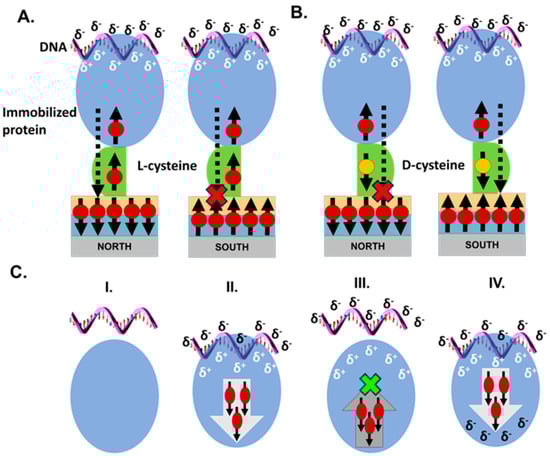 (A) Schematic representation of the mechanism of the effect of spin on protein–DNA interaction. When the spin on the ferromagnet is pointing opposite to the momentary spin of the charge at the interface of the protein, which is adsorbed on the surface through L-cysteine (representative spins and electrons migrating through the protein are shown as black arrows and red balls, respectively), charge flows more efficiently between the protein and the ferromagnetic substrate (shown as a dotted arrow penetrating the substrate). This scenario manifests when the North pole of the magnet is facing the ferromagnetic substrate. When the South pole of the magnet is facing the ferromagnetic substrate, the spins on the protein and the substrate point in the same direction, resulting in inefficient electron flow. (B) The effect of a D-cysteine linker on protein–DNA interaction. The terminal D-cysteine linker, shown in green, which has opposing chirality to the rest of the protein, flips the direction of spins transmitted through the protein (black arrow, yellow ball). Consequently, the opposite magnet polarity is required to achieve electron flow relative to the schematic in A. (C) Model describing the role of electron spin-related polarizability in the docking of a DNA molecule on a protein. The reaction scheme describes the dynamic interaction of a protein molecule with a DNA molecule to form a transient (protein–DNA) complex (charge-reorganization step) and the final energetically favored (protein–DNA) configuration (binding step). (I) The system before DNA–protein interaction. (II) The approaching DNA repels electrons with specific spins away from the binding zone. (III) Upon retraction of the DNA from the protein, the electrons that were withdrawn are not able to flow back because they have the “wrong” spin direction. (IV) The final docking that results in the binding of the DNA to the protein. The figure was copied with permission from reference [34].