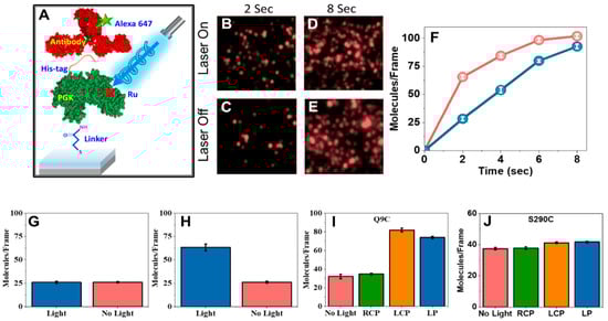 Modulating PGK–antibody interaction kinetics by photoexcitation. (A) Schematic of the experimental setup to study the effect of linearly and circularly polarized light on the interaction kinetics of a His-tagged ruthenium-photosensitizer modified PGK with an anti-His antibody. (B–E) Fluorescent images of individual complexes formed between His-tagged PGK molecules labeled with the photosensitizer at residue 9 and adsorbed on a gold surface and alexa-647-labeled anti-His antibodies in the presence and absence of illumination with linearly polarized light for 2 s and 8 s. (F) Kinetics of PGK–antibody interaction with (red) and without (blue) illumination, as measured by counting molecules in fluorescent images. (G) No effect of illumination on PGK–antibody interaction kinetics was observed in the absence of the photosensitizer. (H) The experiment shown in panels B-E was repeated with PGK adsorbed on glass, with similar results. (I) The effect of the polarization of the light on the photoinduced enhancement of PGK–antibody interaction kinetics. RCP—right circular polarization; LCP—left circular polarization; LP—linear polarization. (J) Only a minor illumination effect was observed when the photosensitizer was moved to residue 290. In (G–J), molecules were counted 2 s following the initiation of the reaction. At least nine regions were counted in each sample.