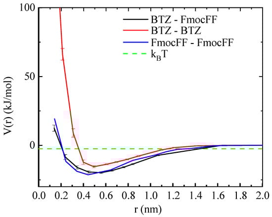 The calculation of PMF quantifies the propensity of the model dipeptides for self-assembly in aqueous environments. The PMF has been computed for all three pairs of molecules in water (i.e., FmocFF–FmocFF; FmocFF–BTZ; BTZ–BTZ), and the corresponding results are displayed in Figure 1.