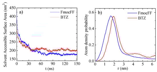 The SASA was computed over the entire 150 ns duration of the simulation run for both the BTZ and FmocFF molecules in the aqueous solution and is presented in Figure 3a.