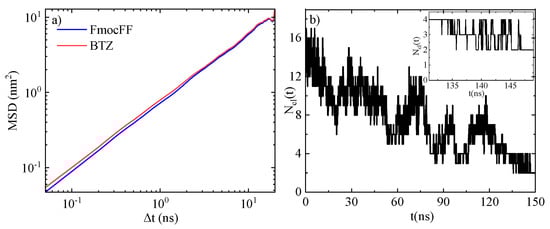 MSD was computed for FmocFF dipeptides and BTZ molecules over the last 20 ns of the trajectory, where cluster formation has been completed and a “steady state” has been achieved.