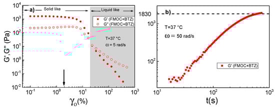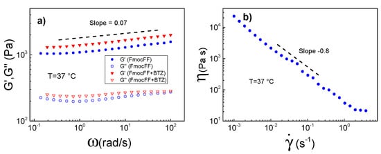 Linear viscoelasticity was characterized by small amplitude oscillatory shear tests. The storage modulus G′ and the loss modulus G″ of the complexes are depicted in Figure 5a. The weak power-law dependence of G′ on the angular frequency ω (slope of 0.07) is reminiscent of the self-similar network corresponding to a gel-like structure [52]. The encapsulation of BTZ does not weaken the gel response; on the contrary, it mildly enhances both moduli. Hence, in both cases, we have hydrogels with a modulus in the low kPa range and the same fractal structure (same slope). When exposed to steady shear flow with a gradually increasing shear rate, the FmocFF + BTZ gel exhibits a shear-thinning response, as shown in Figure 5b with a slope (thinning exponent) of 0.8, typical for hydrogels.