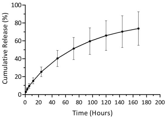 This formula calculates the percentage of drug released at a given time (t) by adding the amount released at time (t) and the amount released at the previous time point (t − 1), relative to the total initial amount of drug encapsulated within the hydrogel. The cumulative release curve is shown in Figure 7.