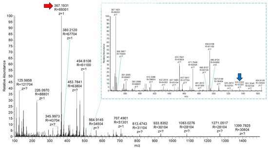 As mentioned previously, the BTZ (exact mass: 384.2) peaks from FmocFF–BTZ release-samples were detected in positive ion mode with the help of an ESI source and the Orbitrap analyzer. The BTZ ions were labile and underwent in-source dehydration to form [M + H-H2O]+, causing the following BTZ-attributed peaks to be observed, within a 5 ppm tolerance, at m/z 226.09, 366.19, 367.19 (precursor m/z, Figure 9), and 368.19, and further validated by the MoNA–MassBank of North America [56].