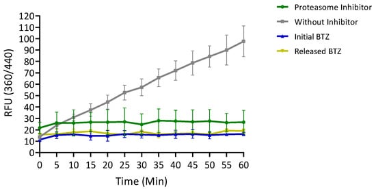 Kinetics of release of the fluorescent AMC product in the assay without inhibitor (gray curve), in the presence of MG-132 inhibitor (green curve), in the presence of the initially encapsulated BTZ (blue curve), and in the presence of BTZ released at 48 h (yellow curve). Mean ± SD (n = 3).