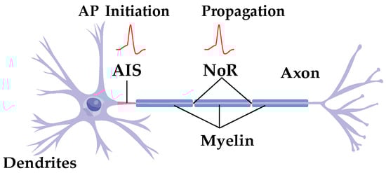 Axon initial segment (AIS) and node of Ranvier (NoR). The AIS is located at the proximal part of the axon and is responsible for initiating the action potential (AP). The NoR is a site of AP propagation.