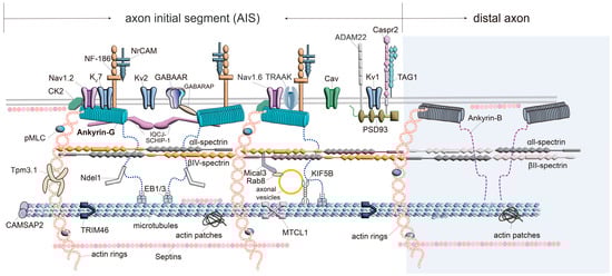 Ankyrin-G is an important protein at the AIS that acts like a scaffold. It plays a central role in organizing various membrane proteins on the cell surface and cytoskeletal components [8,9,10]. By anchoring these elements, Ankyrin-G controls both the functional and structural properties of the AIS [11,12]. It interacts with key molecules, including voltage-gated sodium and potassium channels, the cytoskeletal protein βIV spectrin (Figure 2), and cell adhesion molecules (CAMs). These interactions are vital for maintaining neuronal excitability and ensuring efficient signal transmission. Disruptions in these molecular pathways are associated with the pathophysiology of numerous neurological disorders [13,14,15].