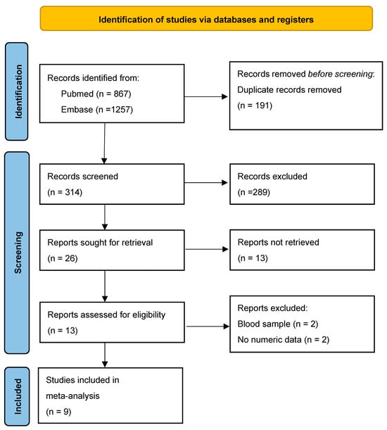 A total of 2124 records were initially retrieved from database searches using targeted keywords. Following the elimination of duplicates and studies not aligned with the research focus, 315 titles and abstracts were screened. Of these, 301 were excluded for reasons such as irrelevance to the study objective, single-arm design, case reports or series, animal-based research, and review articles. Subsequently, the full texts of 13 studies were evaluated for eligibility, resulting in the inclusion of nine studies that fulfilled all predefined criteria for the meta-analysis [,,,,,,,,] (Figure 1).