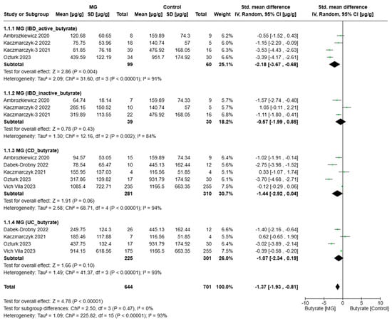 Forest plots of butyrate alterations in MG (IBD patients) vs. Control (Ambrozkiewic 2020 []; Kaczmarczyk-2 2022 []; Kaczmarczyk-3 2021 []; Dabek-Drobny 2022 []; Kaczmarczyk 2021 []; Ozturk 2023 []; Vich Vila 2023 []).