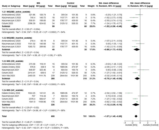 Forest plots of acetate alterations in MG (IBD patients) vs. Control (Ambrozkiewic 2020 []; Kaczmarczyk-2 2022 []; Kaczmarczyk-3 2021 []; Dabek-Drobny 2022 []; Kaczmarczyk 2021 []; Ozturk 2023 []; Vich Vila 2023 []).
