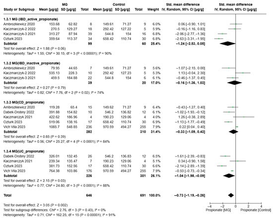 Forest plots of propionate alterations in MG (IBD patients) vs. Control (Ambrozkiewic 2020 []; Kaczmarczyk-2 2022 []; Kaczmarczyk-3 2021 []; Dabek-Drobny 2022 []; Kaczmarczyk 2021 []; Ozturk 2023 []; Vich Vila 2023 []).