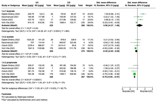 Forest plots of SCFA alterations in UC patients vs. CD patients: 1.4.1 butyrate, 1.4.2 acetate, 1.4.3 propionate (Dabek-Drobny 2022 []; Kaczmarczyk 2021 []; Ozturk 2023 []; Vich Vila 2023 []).