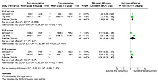 We also conducted an analysis of SCFA production in response to dietary intervention in patients with IBD (Figure 6). The SMDs for butyrate, acetate, and propionate levels before and after the dietary intervention were 1.03 (95% CI, 0.52 to 1.54), 1.12 (95% CI, −1.22 to −3.46), and 0.58 (95% CI, −0.26 to 1.43), respectively (Figure 5). The studies included in the analysis of butyrate levels showed an I2 value of 0%, indicating no observed heterogeneity among these studies. In contrast, studies assessing acetate and propionate levels exhibited substantial heterogeneity, with I2 values exceeding 50%.