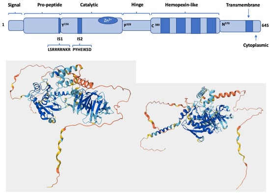 Structure of MT5-MMP indicated by (top) domain organization [] and (bottom left and right) three-dimensional fold (AlphaFold; https://alphafold.ebi.ac.uk/entry/Q9Y5R2 (accessed on 16 May 2025)). The predicted structure for MT5-MMP (3 alpha-helices and 5 beta-sheets within the globular catalytic domain, left blue-colored domain in bottom-left figure; 4 bladed propeller hemopexin-like domain with each blade containing 4 antiparallel beta-strands, right blue-colored domain in bottom-left figure) is analogous to other MMP family members. For the AlphaFold structure, dark blue is very high confidence (per-residue confidence score (Local Distance Difference Test; pLDDT) > 90), light blue is moderate confidence (90 > pLDDT > 70), yellow is low confidence (70 > pLDDT > 50), and orange is very low confidence (pLDDT < 50).