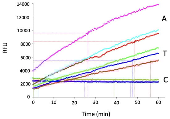 Activity of MT5-MMP toward fTHP-15. Assay was performed in triplicate, where A = activation by 4-aminophenylmercuric acetate (APMA) (light purple, light blue, and dark red lines), T = activation by trypsin (light green, blue, and red lines), and C = control (substrate alone) (green, purple, and dark blue lines). The full sequence of fTHP-15 is (Gly-Pro-Hyp)5-Gly-Pro-Lys(Mca)-Gly-Pro-Gln-Gly~Leu-Arg-Gly-Gln-Lys(Dnp)-Gly-Val-Arg-(Gly-Pro-Hyp)5-NH2. Methods for monitoring MMP activity towards fTHP-15 have been previously described []. RFUs = relative fluorescence units.