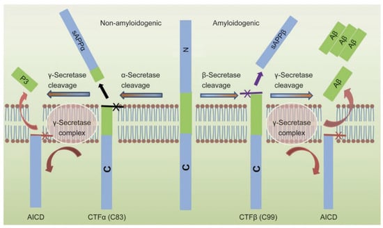Processing of amyloid precursor protein (center) by β-secretase (right pathway) to produce sAPPβ and CTFβ/C99 or by α-secretase (left pathway) to produce sAPPα and CTFα/C83 []. Subsequent processing by γ-secretase produces Aβ (right pathway) or P3 (left pathway). Figure reproduced from [] by permission of Springer Nature.