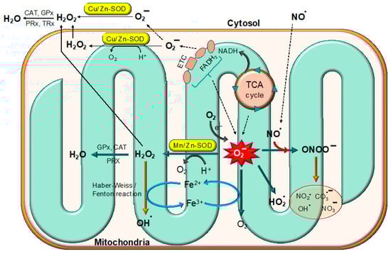 Superoxide free radicals are produced in mitochondria by the ETC chain and the TCA cycle. The superoxide radicals are detoxified by different superoxide dismutases (SODs) such as Mn/Zn-SOD and Cu/Zn-SOD.