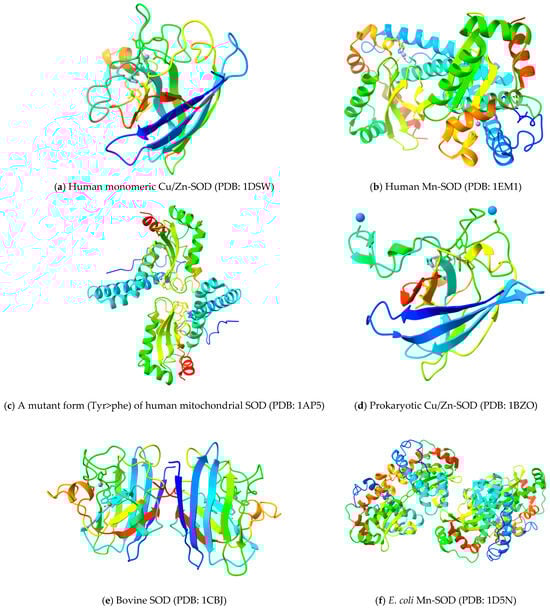 Cu,Zn-SOD, the product of the SOD1 gene from bovine erythrocytes (BtCu,Zn-SOD, PDB code 2SOD), was first fully three-dimensionally modeled in 1982 [18]. Human Cu,Zn-SOD’s structure (HsCu,Zn-SOD, PDB code 1SOS) was solved in 1992 [30], demonstrating that the fold and domain organization of the enzyme were highly conserved in eukaryotes and later offering insights into amyotrophic lateral sclerosis (ALS) [31]. Numerous Cu,Zn-SOD structures from various eukaryotic species have since been identified. The structure of this eukaryotic enzyme is highly conserved across species [32]. These include the nuclear magnetic resonance (NMR) structures of the human Cu,Zn-SOD [33], and the X-ray crystal structures of the Cu,Zn-SODs from budding yeast [34,35,36], trematodes [37], frogs [38], spinach [39], and flowers of P. atrosanguina [40]. Human Cu,Zn-SOD has a high degree of sequence homology (83%) with the bovine Cu,Zn-SOD, along with similarities in three-dimensional structure, domain organization, amino acid sequence, protein folding, and catalytic properties [41,42]. The three-dimensional structures of different SOD forms in different organisms with the mentioned protein data bank (PDB) codes are provided in Figure 3.