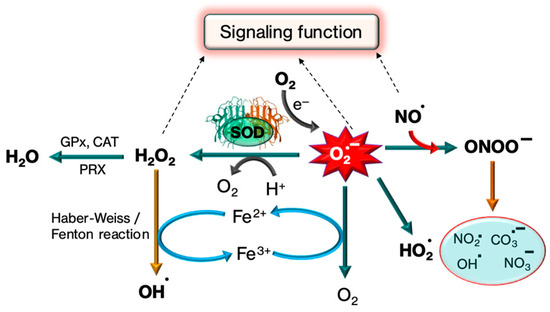 Superoxide anion (O2−) is an important ROS and is formed by several enzymatic and non-enzymatic pathways (Figure 2). Like other ROS, O2− causes oxidative damage to cellular biomolecules under specific conditions [8]. O2− stimulates oxidation through various mechanisms such as the reduction of transition metals, the induction of metal release from proteins, forming conjugated acids in a pH-dependent manner and spontaneously dismutating itself into hydrogen peroxide [9]. According to previous reports, O2− interacts with proteins, lipids, and nucleic acids more frequently than it does with low-molecular-weight antioxidants. Therefore, when compared to low-weight antioxidants, O2− is a highly reactive oxygen species that is famous for its contribution in the pathogenesis of several diseases. The pathogenesis of O2− depends on its concentration, location and cellular conditions [10].