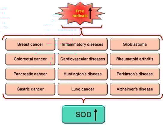 Many diseases, including cancer, are linked to high levels of ROS or free radicals, which produce oxidative stress. Cu,Zn-SODs, antioxidant enzymes, are linked to a number of diseases because they are essential for detoxifying ROS (Figure 5).The most common pathological conditions such as inflammatory bowel disease, obesity and its consequences—diabetes and hypertension—and chronic obstructive pulmonary disease, have been linked to changes in Cu,Zn-SOD (SOD1 and SOD3) activity and its expression. Furthermore, the likelihood of acquiring a certain disease or its worsening has been linked to a number of SOD1 and SOD3 gene polymorphisms [60].