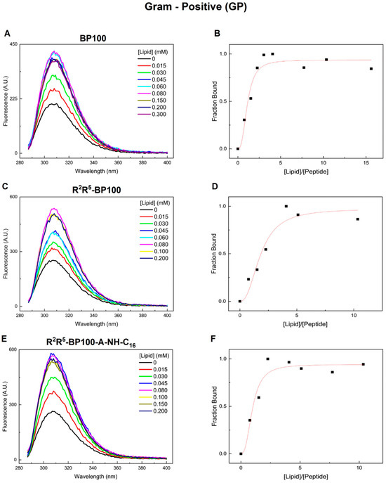 Tyrosine fluorescence emission spectrum of the peptides as a function of Gram-positive (GP) LUV concentration in Tris-HCl 0.01 M, pH 7.4, buffer. (A) BP100, (C) R2R5-BP100, and (E) R2R5-BP100-A-NH-C16. Fraction of LUV-bound peptide as a function of the lipid/peptide ratio: (B) BP100, (D) R2R5-BP100, and (F) R2R5-BP100-A-NH-C16. Initial [Peptide] = 20 μM.