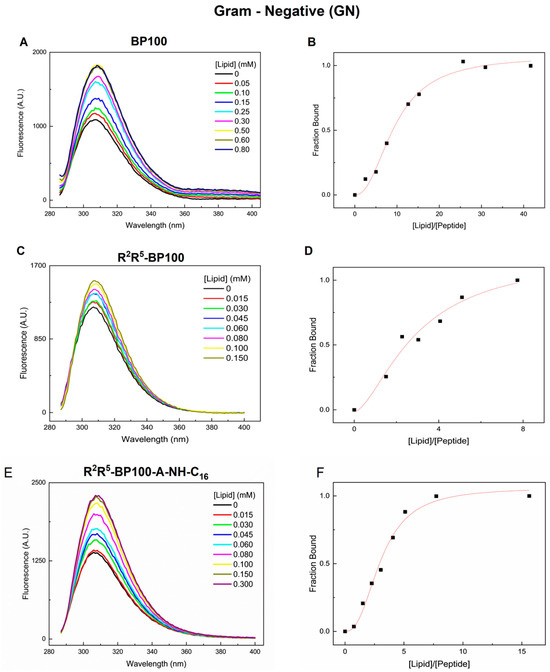 Tyrosine fluorescence emission spectrum of the peptides as a function of Gram-negative (GN) LUV concentration in Tris-HCl 0.01 M, pH 7.4, buffer: (A) BP100, (C) R2R5-BP100, and (E) R2R5-BP100-A-NH-C16. Fraction of LUV-bound peptide as a function of the lipid/peptide ratio: (B) BP100, (D) R2R5-BP100, and (F) R2R5-BP100-A-NH-C16. Initial [Peptide] = 20 μM.