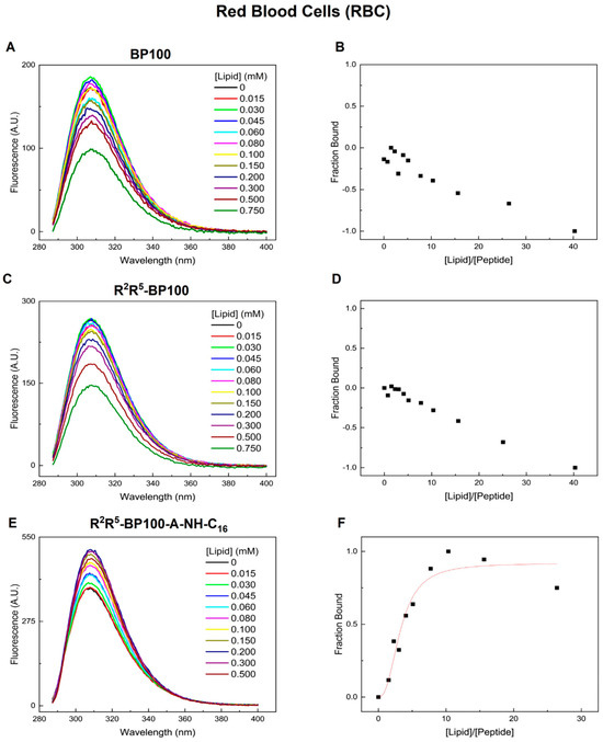Tyrosine fluorescence emission spectra of the peptides as a function of red blood cell (RBC) LUV concentration in Tris-HCl 0.01 M, pH 7.4, buffer. (A) BP100, (C) R2R5-BP100, and (E) R2R5-BP100-A-NH-C16. Fraction of LUV-bound peptide as a function of the lipid/peptide ratio: (B) BP100, (D) R2R5-BP100, and (F) R2R5-BP100-A-NH-C16. Initial [Peptide] = 20 μM.