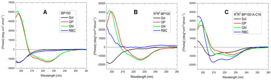 Typically, an α-helical conformation yields CD spectra with a maximum at 190–195 nm and a double negative peak with similar intensities, with minima at 208 nm and 220 nm [45]. Solution spectra of BP100 (Figure 4A) and R2R5-BP100 (Figure 4B) indicate that, in the absence of LUVs, these peptides were disorganized. In contrast, the R2R5-BP100-A-NH-C16 spectrum suggests some degree of peptide organization, possibly due to aggregation triggered by the long acyl chain, leading to a micellar-type arrangement (Figure 4C). The spectrum of RBC-bound R2R5-BP100-A-NH-C16 (Figure 4C, blue line) is the only one that fulfills the description of a typical α-helix. In previous work, we demonstrated that BP100 acquires an α-helical conformation upon binding to POPC: POPG LUVs [24], in agreement with other studies [46]. For BP100, the presence of RBC-LUVs did not affect the peptide conformation (Figure 4A).