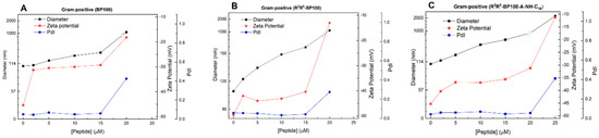 Effect of (A) BP100, (B) R2R5-BP100, and (C) R2R5-BP100-A-NH-C16 on the diameter (Dh), polydispersity (PDI), and zeta potential (ζ) of Gram-positive (GP) LUVs prepared in Tris-HCl 0.01 M, pH 7.4, buffer. The lipid concentration was 100 μM.