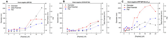 Effect of (A) BP100, (B) R2R5-BP100, and (C) R2R5-BP100-A-NH-C16 on the diameter (Dh), polydispersity (PDI), and zeta potential (ζ) of Gram-negative (GN) LUVs. LUVs were prepared in 0.01 M Tris-HCl buffer, pH 7.4. The lipid concentration was 100 μM.