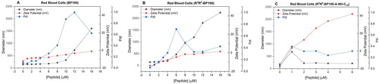 Effect of (A) BP100, (B) R2R5-BP100, and (C) R2R5-BP100-A-NH-C16 on the diameter (Dh), polydispersity PDI, and zeta potential (ζ) of RBC-LUVs. LUVs were prepared in 0.01 M Tris-HCl buffer, pH 7.4. The lipid concentration was 100 μM.