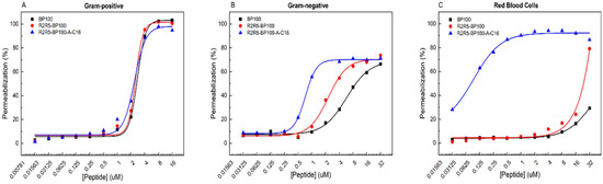 BP100 and R2R5-BP100 were considerably active against both GP and GN bacteria. More studies are required to correlate the results obtained for model systems with those for bacteria, as the latter are much more complex entities, and their organization varies with metabolic conditions, among other factors. MIC values of BP100 and R2R5-BP100 were lower than those of R2R5-BP100-A-NH-C16. In contrast, the two peptides essentially lacked hemolytic activity, whereas the long-tail-containing analog was highly effective. Thus, the results obtained for R2R5-BP100-A-NH-C16 are undesirable from both therapeutic and toxicity points of view. Although similar results have been obtained for other AMPs, several studies have focused on lipopeptides as therapeutic agents.