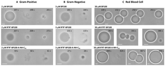 Phase contrast optical microscopy images of GUVs composed of lipid mixtures mimicking (A) Gram-positive, (B) Gram-negative, and (C) red blood cells in the presence of BP100 (top row), R2R5-BP100 (middle row), and R2R5-BP100-NH-C16 (bottom row). The timestamps on each figure are relative to the moment of adding the GUVs to the observation chamber containing the desired peptide concentration, as indicated above each image or sequence. The scale bars represent 5 μm (A,B) and 10 μm (C).