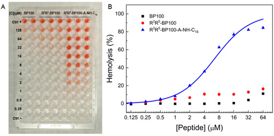 (A) Plate depicting peptide-induced hemolysis. Duplicates were run for BP100, while triplicates were run for R2R5-BP100 and R2R5-BP100-NH-C16. (B) Hemolytic activity of BP100 (black), R2R5-BP100 (red), and R2R5-BP100-NH-C16 (blue) as a function of peptide concentration. Red blood cells: 5% (v/v) in PBS, pH 7.0.