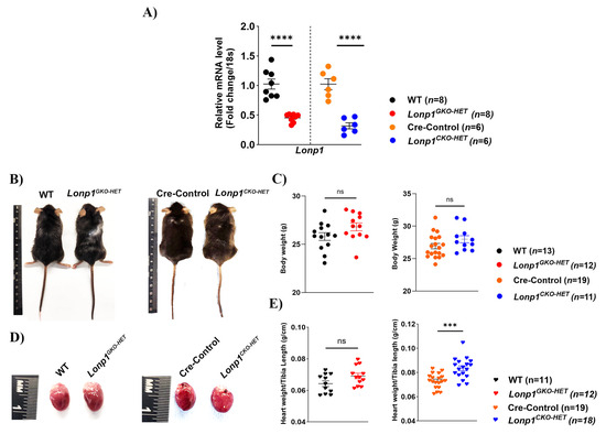 Effect of both systemic and cardiac-specific Lonp1 haploinsufficiency on body and heart morphology. (A) A significant reduction in Lonp1 expression is observed in both heterozygous models compared to their respective controls, confirming the efficiency of the partial knock-out in the groups as determined by RT-PCR analysis of Lonp1 mRNA levels. (B) Representative dorsal views of male global heterozygous mice (Lonp1GKO-HET) and their wild-type (WT) littermates, and cardiomyocyte-restricted heterozygous mice (Lonp1CKO-HET) and their Cre-Control littermates and (C) corresponding scattered dot plots of their body weight. (D) Representative excised whole heart images of Lonp1GKO-HET and their wild-type (WT) littermates, and Lonp1CKO-HET and their Cre-Control littermates and (E) corresponding scattered dot plots of their heart-weight-to-tibia-length ratio (HW/TL). Values are represented as mean ± S.E.M. ns represents non-significant, **** p < 0.0001, *** p < 0.001 is considered significant by Student’s t-test.