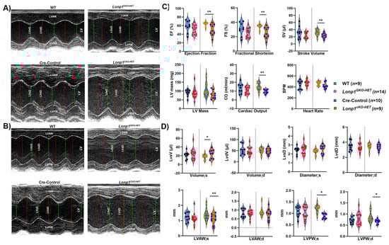 Echocardiographic assessment of cardiac function in both Lonp1 haploinsufficiency groups. Representative M-mode (parasternal short-axis) from male (A) and female (B) Lonp1GKO-HET, Lonp1CKO-HET, and their respective control littermates. Green and red cursors delineate systolic (s) and diastolic (d) phases of the left ventricle. (C,D) Quantitative analysis of key functional parameters, including ejection fraction (EF), fractional shortening (FS), stroke volume (SV), cardiac output (CO), left-ventricular mass (LV mass), systolic volume and diameter, and anterior and posterior wall thickness obtained from VevoF2 Micro-Ultrasound Imaging System. LVsD; Left Ventricular systolic Diameter, LVdD; Left Ventricular diastolic Diameter, LVAW; Left Ventricular Anterior Wall, LVPW; Left Ventricular Posterior Wall, LV; Left Ventricular chamber. Values are represented as mean ± S.E.M. * p < 0.05, ** p < 0.01 is considered significant by Student’s t-test.