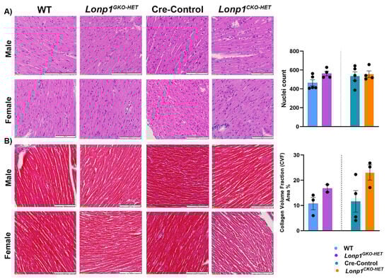 To evaluate whether partial loss of Lonp1 affects myocardial structure, we performed histological analyses of transverse heart sections from 12-week-old male and female mice across four genotypes: WT, Lonp1GKO-HET, Cre-Control, and Lonp1CKO-HET. Haematoxylin and eosin (HE) staining revealed preserved global myocardial architecture in WT, and Lonp1GKO-HET hearts across sexes, with compact and uniformly aligned cardiomyocytes and no signs of inflammatory infiltration or cellular degeneration. In contrast, Lonp1CKO-HET hearts, particularly those from male mice, exhibited a trend toward mild myocardial remodeling, characterized by subtle myocyte irregularity, increased variability in nuclear alignment, and a slightly more heterogeneous tissue appearance. In Lonp1CKO-HET hearts, a trend toward localized, mild perivascular and interstitial collagen accumulation was observed in males. Collectively, these results suggest that cardiac-specific haploinsufficiency of Lonp1 may initiate early signs of structural remodeling. However, these changes are more of trends rather than definitive pathological alterations. These trends were less prominent in female Lonp1CKO-HET hearts, suggesting a potential sex-dependent difference in the structural response to cardiac-specific Lonp1 haploinsufficiency (Figure 3A and Figure S2). To assess fibrotic remodeling, we performed Masson’s trichrome staining on matched heart sections. Lonp1GKO-HET hearts exhibited minimal collagen deposition, consistent with normal myocardial homeostasis, compared to their wild-type (WT) littermates. In Lonp1CKO-HET hearts, trichrome staining revealed localized, mild perivascular and interstitial collagen accumulation in males, while female hearts showed no significant fibrosis compared to their Cre-Control littermates (Figure 3B and Figure S2). Despite these observations, overall collagen deposition remained low, and quantitative collagen fraction analysis did not reveal statistically significant differences across groups. Collectively, these results indicate that cardiac-specific haploinsufficiency of Lonp1 is sufficient to initiate early structural remodeling without triggering widespread fibrosis at 12 weeks of age. The absence of overt fibrotic changes suggests that these alterations may represent an adaptive response to early mitochondrial stress rather than irreversible pathological remodeling, with potential modulation by sex-specific factors.