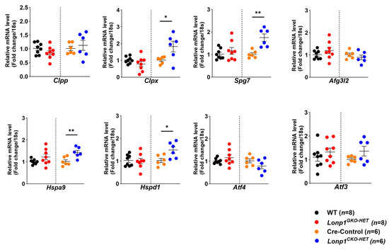 Among the investigated transcripts, Clpp expression remained unchanged across all groups, while Clpx expression was significantly upregulated in Lonp1CKO-HET hearts compared to their Cre-Control littermates (Figure 4). Similarly, Spg7 mRNA levels were significantly elevated in Lonp1CKO-HET hearts, whereas Afg3l2 levels showed no significant difference among the genotypes (Figure 4). The mitochondrial chaperones Hspa9 and Hspd1 were both significantly increased in Lonp1CKO-HET mice compared to Cre-Controls, with no change in the expression of Atf4 and Atf3, two transcription factors involved in integrated stress response signaling (Figure 4). In contrast, Lonp1GKO-HET hearts exhibit no measurable differences in the expression of Hspa9, Hspd1, Atf4, and Atf3 compared to their WT littermates (Figure 4). Together, these findings suggest that the partial loss of Lonp1, specifically in cardiomyocytes but not in global tissues, activates a tissue-specific stress response characterized by the selective upregulation of stress-responsive proteases and chaperones, without affecting global integrated stress response markers.