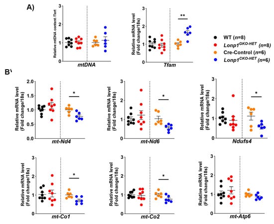 The heart is highly dependent on mitochondrial metabolism, and sustaining a healthy mitochondrial population is of utmost importance for cardiac homeostasis [24]. To investigate whether Lonp1 haploinsufficiency affects mitochondrial DNA (mtDNA) content and the transcription of mitochondrial genes, we analyzed the relative mtDNA content, expression of mitochondrial transcription factor A (Tfam), and selected nuclear- and mtDNA-encoded genes involved in oxidative phosphorylation (OXPHOS). Relative mtDNA content remained unchanged in both Lonp1GKO-HET and Lonp1CKO-HET hearts, compared to their respective littermate controls (Figure 5A). In contrast, expression of Tfam was significantly upregulated in Lonp1CKO-HET hearts compared to Cre-Controls (Figure 5A). The expression of mt-Nd4 and mt-Nd6, encoding subunits of Complex I, was significantly reduced in Lonp1CKO-HET hearts (Figure 5B). Similarly, the expression of nuclear-encoded Complex I subunit Ndufs4 was also significantly lower in Lonp1CKO-HET compared to Cre-Control (Figure 5B). We also examined genes encoding subunits of Complex IV and Complex V; mt-Co1 and mt-Co2, which encode cytochrome c oxidase subunits I and II, were significantly downregulated in Lonp1CKO-HET hearts (Figure 5B). Expression of mt-Atp6, a subunit of ATP synthase, showed no significant changes across genotypes (Figure 5B). Together, these findings suggest that cardiac-specific Lonp1 haploinsufficiency disrupts the transcriptional regulation of key mitochondrial genes involved in biogenesis and oxidative phosphorylation, without altering overall mtDNA content, which is not observed in Lonp1GKO-HET hearts.