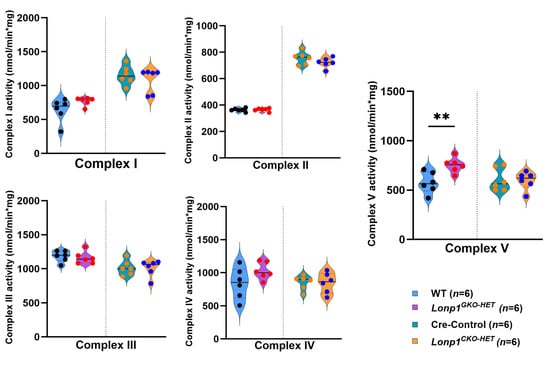 To determine whether Lonp1 haploinsufficiency affects the activities of electron transport chain (ETC) Complexes I–V in heart lysates from 12-week-old mice of different genotypes (Figure 6). The activities of Complexes I, II, III, and IV were not significantly different among the groups compared with their respective controls. However, Complex V (ATP synthase) activity was significantly increased in Lonp1GKO-HET hearts compared to their WT littermates, while Complex V activity in Lonp1CKO-HET remained comparable to Cre-Control, suggesting a differential compensatory adaptation in systemic versus cardiac-restricted Lonp1 haploinsufficiency.