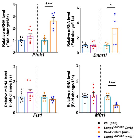 Lonp1 haploinsufficiency alters mitochondrial dynamics in a cardiac-specific manner. The relative mRNA expression levels of mitophagy-associated transcripts, such as Pink1, Dnm1l, Mfn1, and Fis1 in Lonp1CKO-HET, Lonp1GKO-HET, and their respective control mice. Values are represented as mean ± S.E.M. * p < 0.05, *** p < 0.001 is considered significant by Student’s t-test.