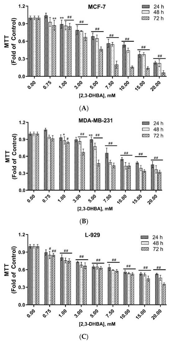 In vitro cytotoxic activity of 2,3-DHBA against (A) MCF-7 and (B) MDA-MB-231 human breast cancer cells and (C) L-929 healthy fibroblast cells. The results were given as ± SD (significance relative to control; * p < 0.05, ** p < 0.005, # p < 0.0005, ## p < 0.0001) (n = 6).