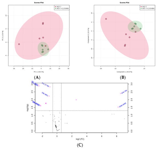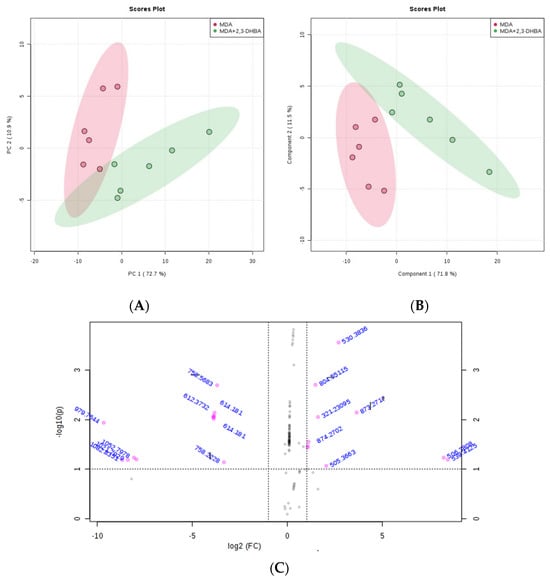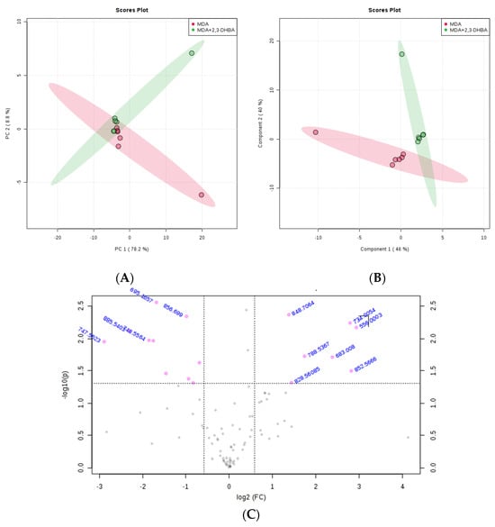 The MetaboAnalyst 4.0 (http://www.metaboanalyst.ca/; accessed on 21 June 2025) and LIPID MAPS (http://www.lipidmaps.org/; accessed on 24 June 2025) databases were used to process the ESI-MS data according to the specifications in the experimental section. MetaboAnalyst 4.0 was used to evaluate differences between groups using Excel data derived from the spectra shown in Figure 2, Figure 3, Figure 4 and Figure 5. Multivariate unsupervised principal component analysis (PCA) and partial least squares discriminant analysis (PLS-DA) of spectral data comparing the control and 2,3-DHBA-treated groups showed distinct clustering within both the MCF-7 cell lipidome (Figure 2A–C and Figure 3A–C) and MDA-MB-231 cell lipidome (Figure 4A–C and Figure 5A–C). Score plots for both PIM (Figure 2A,B and Figure 4A,B) and NIM (Figure 3A,B and Figure 5A,B) demonstrated clear separation between the control and 2,3-DHBA treatment groups. Volcano plot analysis, which combines t-test results (Figures S17, S19, S21 and S23) and the fold change (Figures S18, S20, S22 and S24) to identify lipid species with significant alterations between groups, was performed using the numerical mass-to-charge (m/z) ratios. This analysis compares the log fold change of each m/z value (X-axis) to the significance value (Y-axis). Volcano plot analysis of significantly altered m/z values for pairwise comparisons between the DMSO-treated (control) and 2,3-DHBA treatment groups was conducted for the MCF-7 cell lipidome in both PIM and NIM (Figure 2C and Figure 3C) and for the MDA-MB-231 cell lipidome in both PIM and NIM (Figure 4C and Figure 5C).